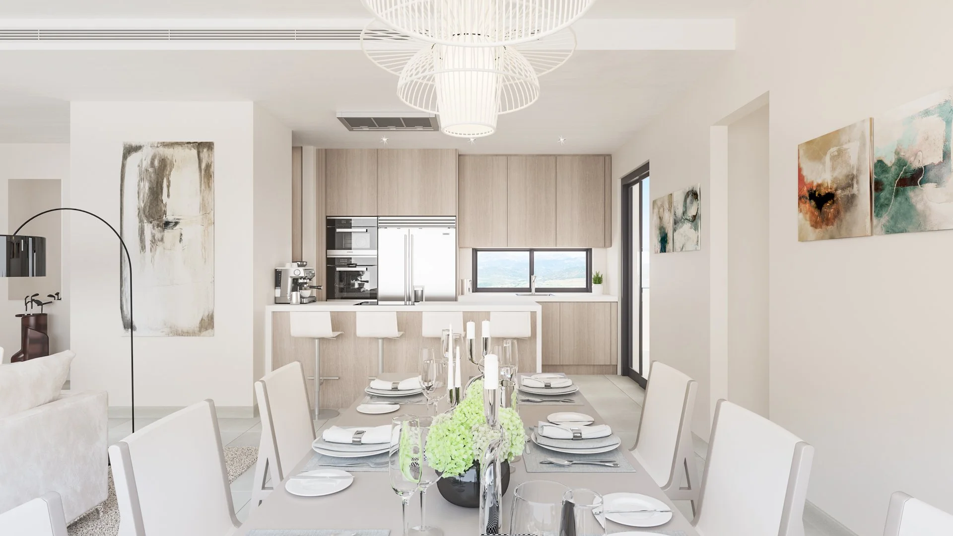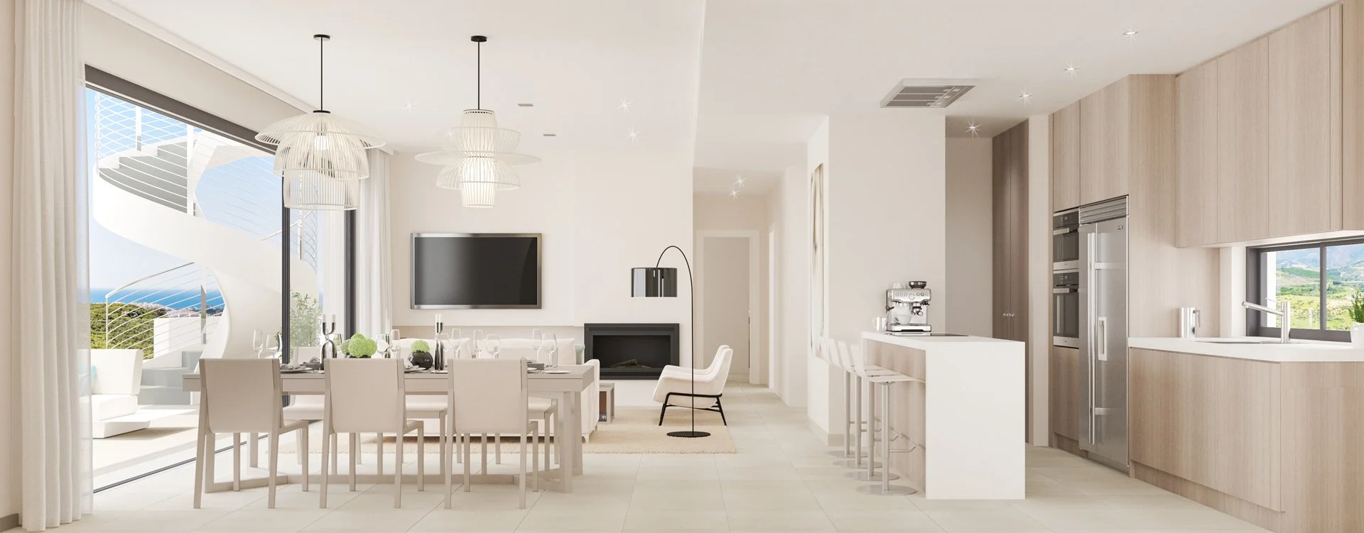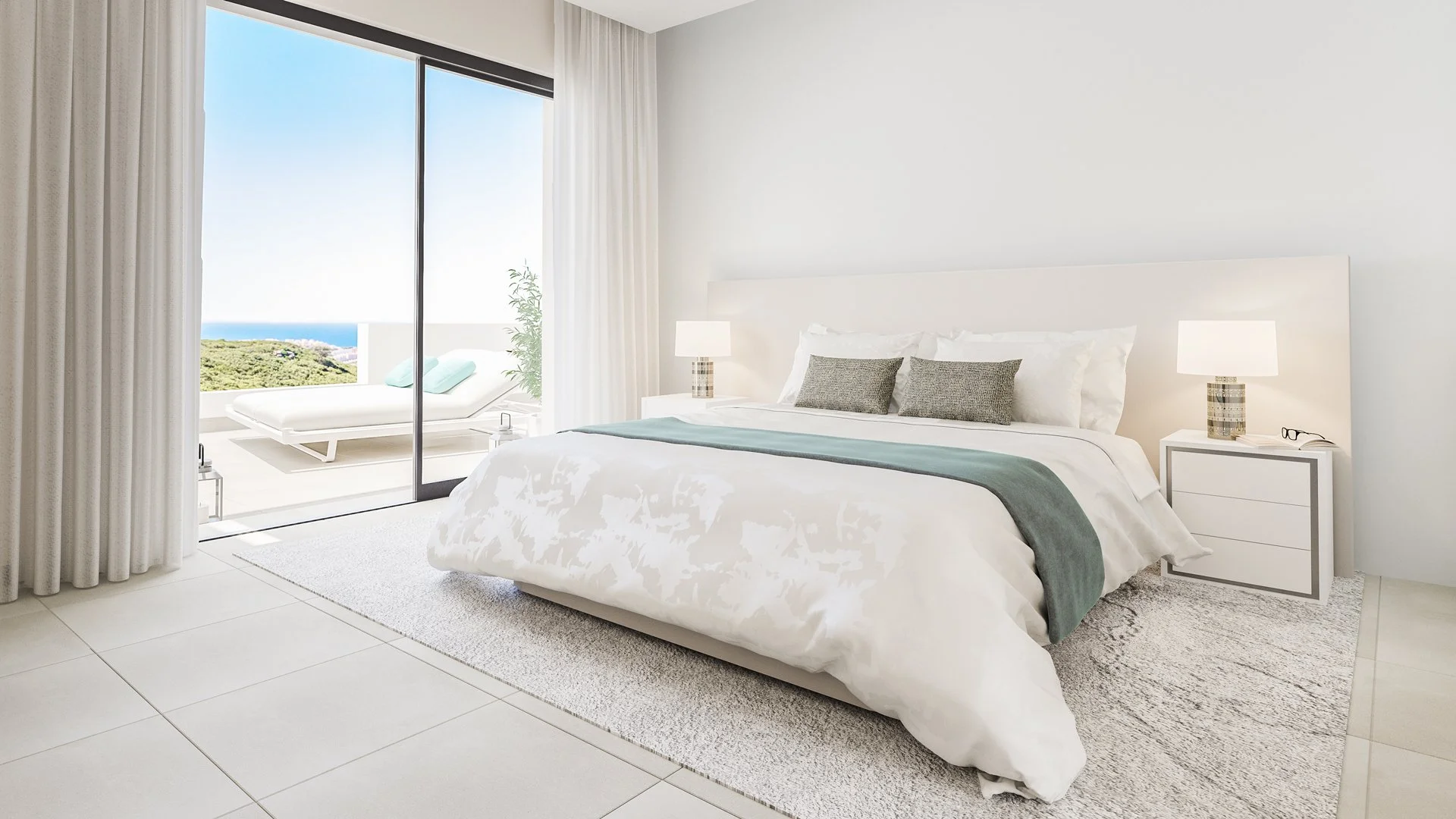 Renders de interiorismo de una vivienda, perteneciente al conjunto residencial Seaview, de 44 viviendas ubicado en la urbanización Casares Finca Cortesín en la provincia de Málaga.